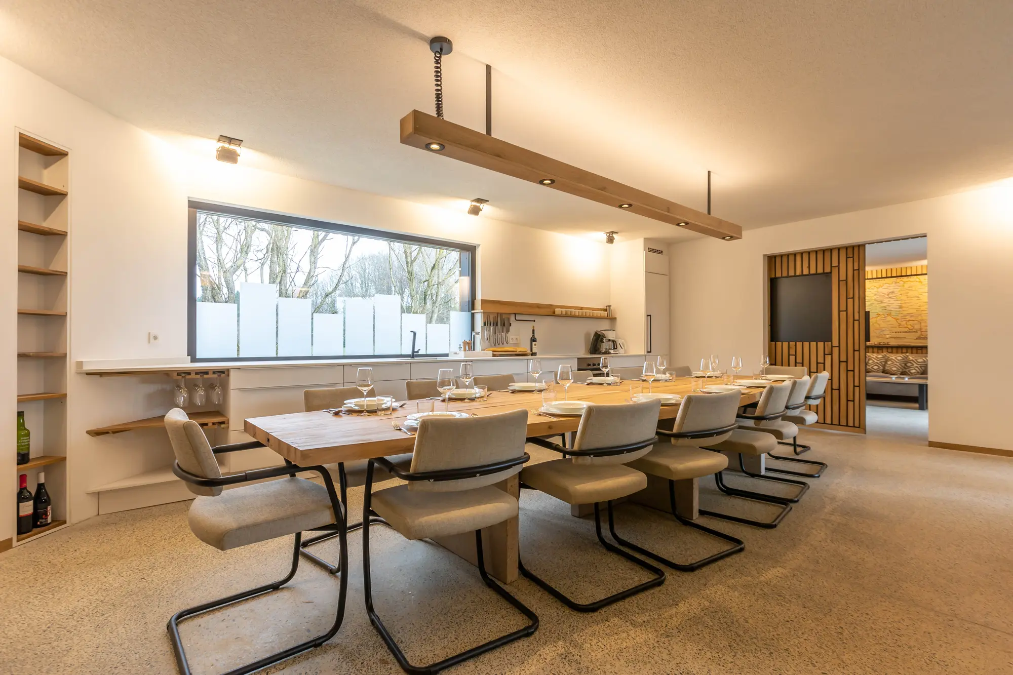 Der große Esstisch bietet 14 Personen Platz gemeinsam im Kreis das Essen zu genießen.