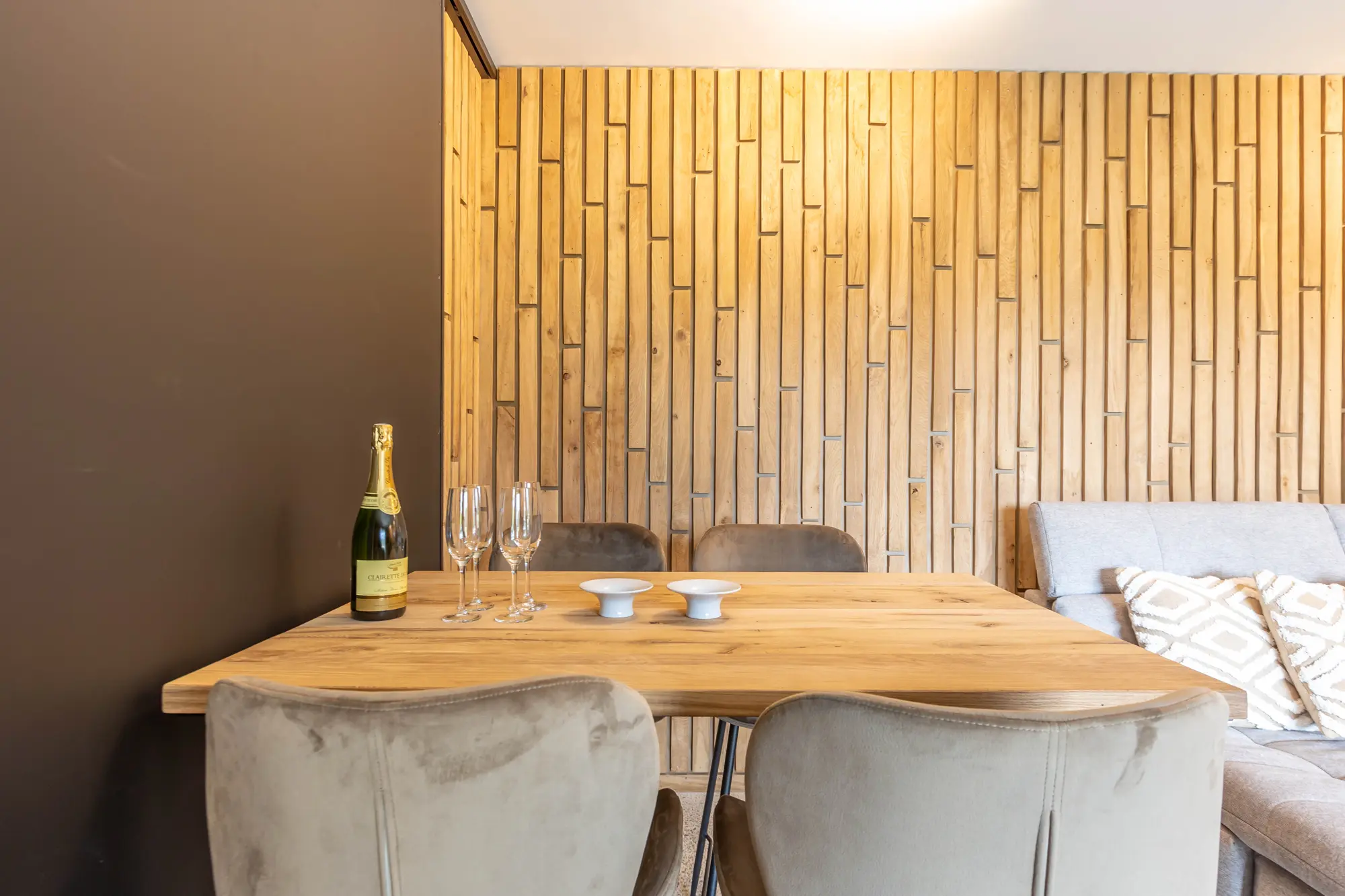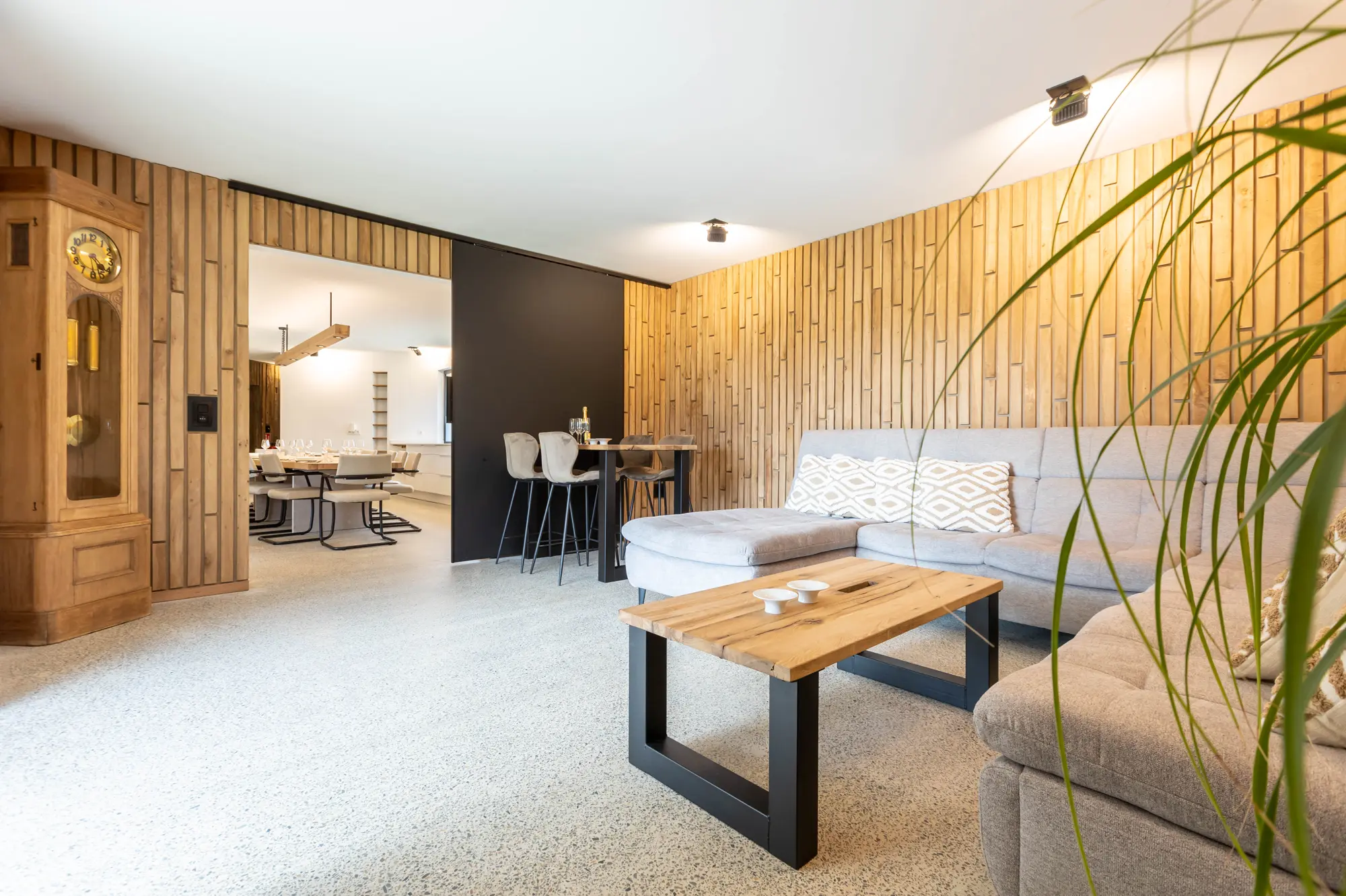 Das Wohnzimmer befindet sich direkt neben der Küche und kann durch eine Schiebtür räumlich von dieser abgetrennt werden. Auch hier sorgt die Bekleidung der Wände mit natürlichem Holz für eine ruhige und akustisch angenehme Atmosphäre.