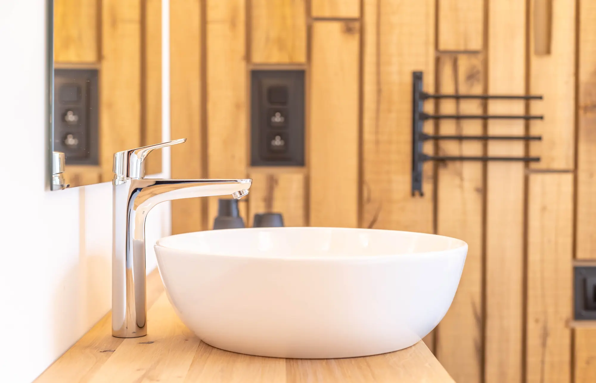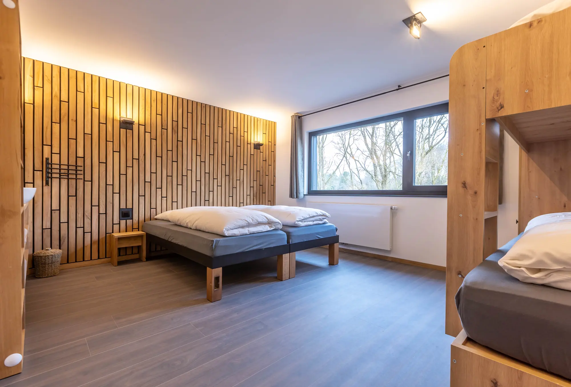 Die drei Doppelzimmer sowie die beiden Familienzimmer (Doppelbett + Etagenbett) verfügen jeweils über einen Waschbereich mit Waschbecken.